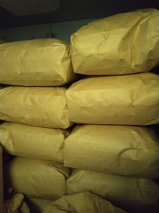 収穫したお米は、乾燥・籾摺り(もみすり)を経て、こうして米袋に詰められます。